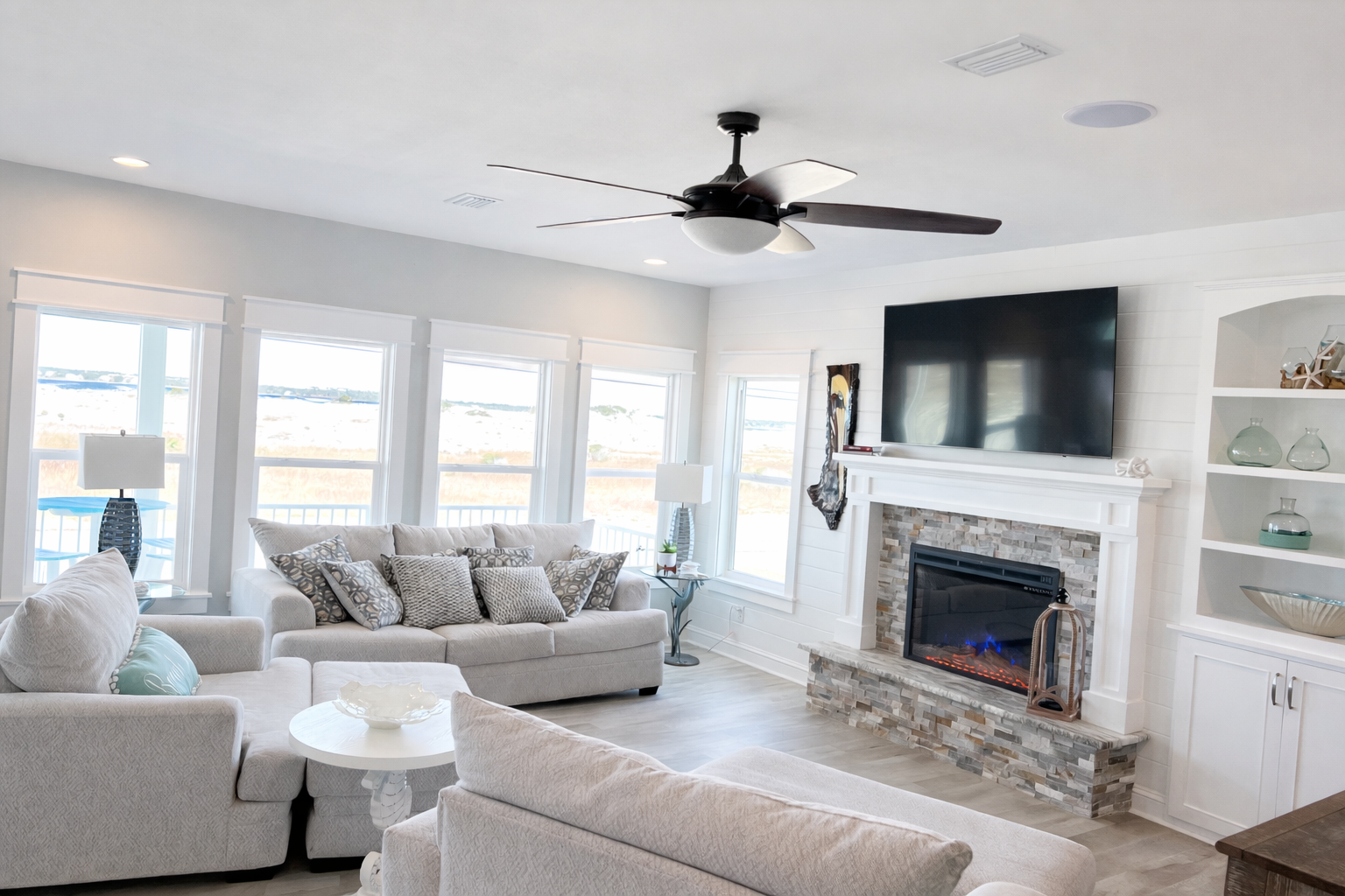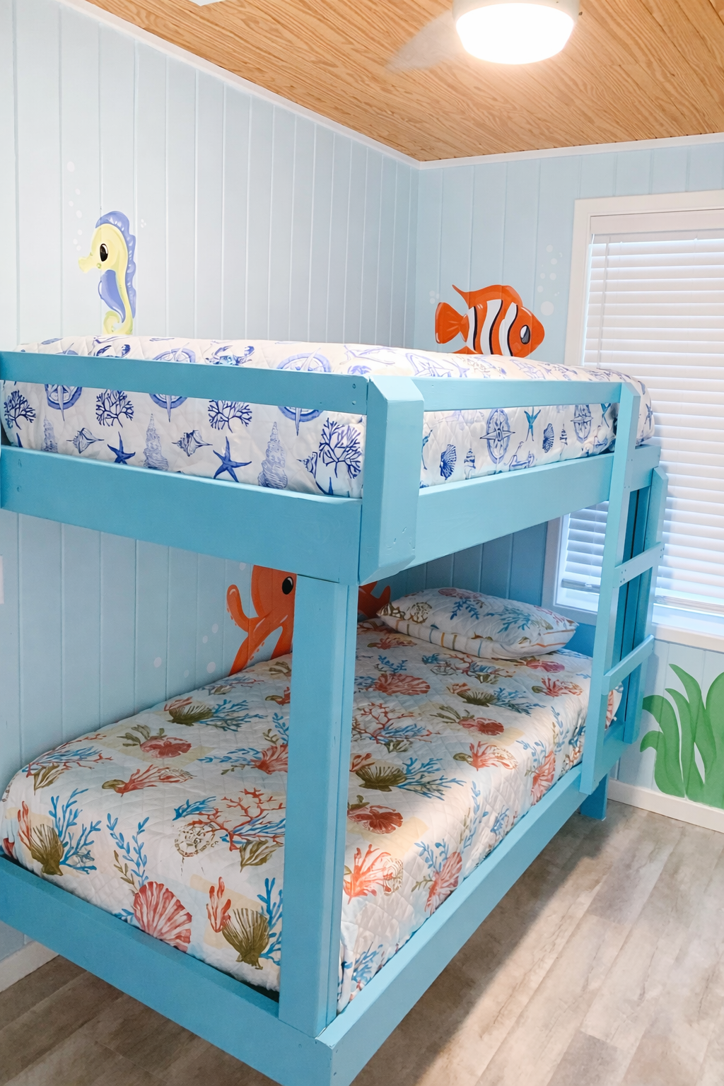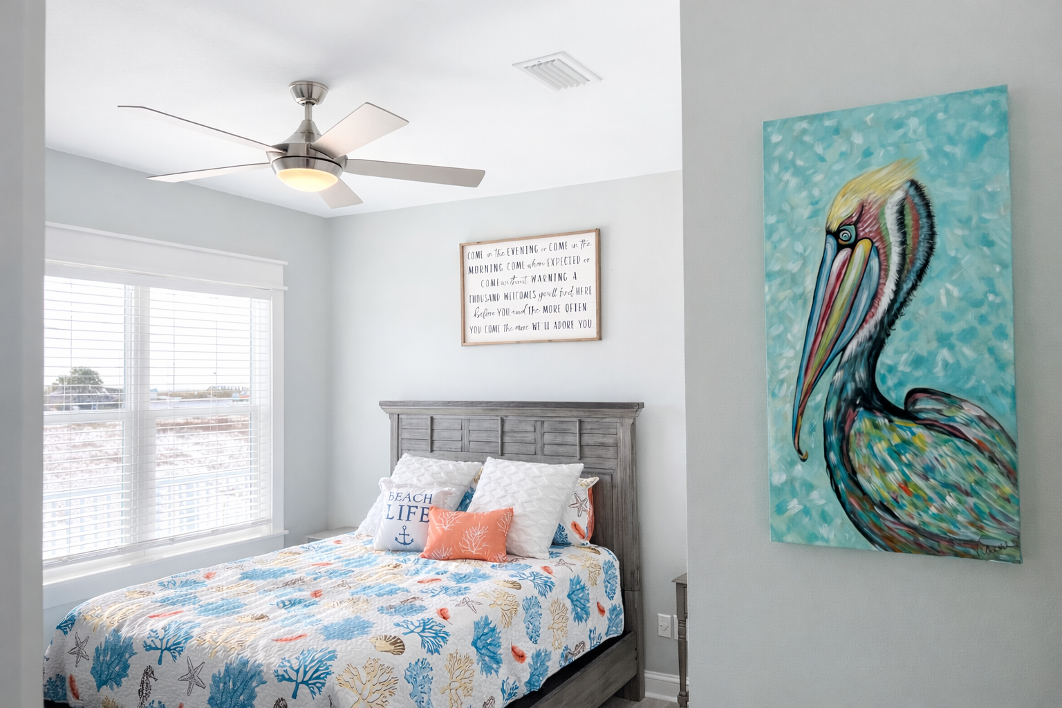 4 Bedrooms • 3 Bathrooms (2 full, 1 half) 3 Baths (2 full, 1 half) • Sleeps 1-12At Family Adventure Vacations, we provide our guests with a fun, family inspired rental! This adorable 3 bedroom, 2.5 bath beach house is your Link to Paradise! Sit on the porch with the amazing views of the Santa Rosa Sound, or take a very short walk/golf cart ride to the gulf. The Master bedroom is on the top floor and features a king size bed, a full bathroom with tub and shower, and a private balcony. The laundry room is located right off the master bathroom. On the main floor the guest room has a queen size bed. The second room on the main level has a queen size Murphy bed, as well as a futon. Through the second room, you will enter the kids’ bunk room. This room has a really fun, four wall under sea mural with a twin over twin bunk bed. The two bedrooms share a guest bathroom with a combination shower/tub. Off of the kitchen is an adorable bar room with an additional table. The garage has an air conditioned room to hang out and watch tv, and a 4 seater golf cart available for you to rent.
